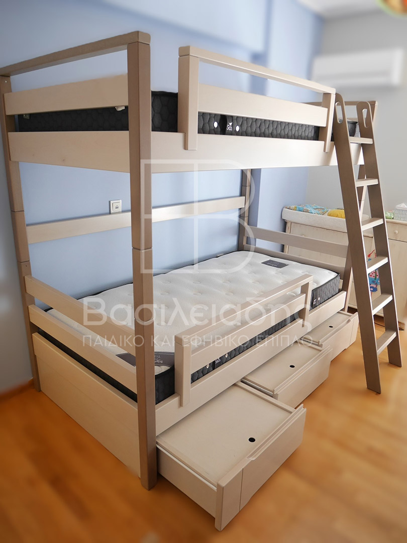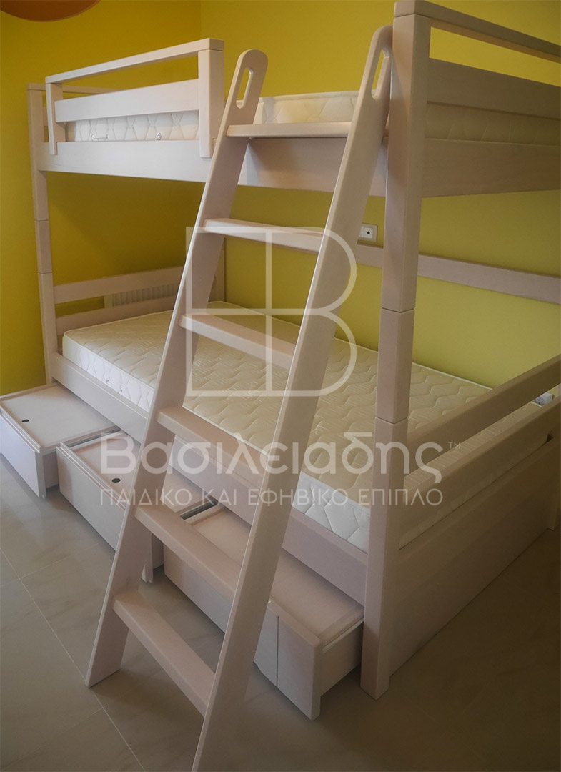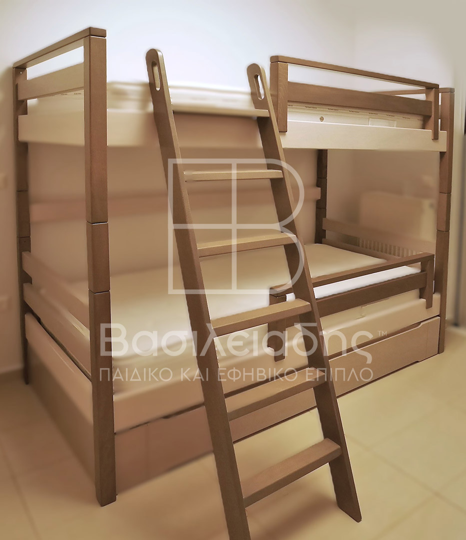 Κουκέτα εξ΄ολοκλήρου από μασίφ ξύλο οξιάς. Τα κρεβάτια είναι διαιρούμενα σε δύο ανεξάρτητα. Η σκάλα γίνεται ή λοξή ή κάθετη. Η κουκέτα προτείνεται σε απλή διώροφη ή με προσθήκη 3ου συρόμενου κρεβατιού, ή με προσθήκη τριών ανεξάρτητων συρταριών αποθήκευσης, για κάλυψη της αντίστοιχης ανάγκης με μία από τις προτάσεις μας. Η κουκέτα κατασκευάζεται σε μονή διάσταση 100cm, ή σε ημίδιπλη διάσταση 110cm εξωτερικά και μήκος ή 200cm ή 212cm. Mεγάλη ποικιλία οικολογικών διάφανων και μη, χρωματικών επιλογών.