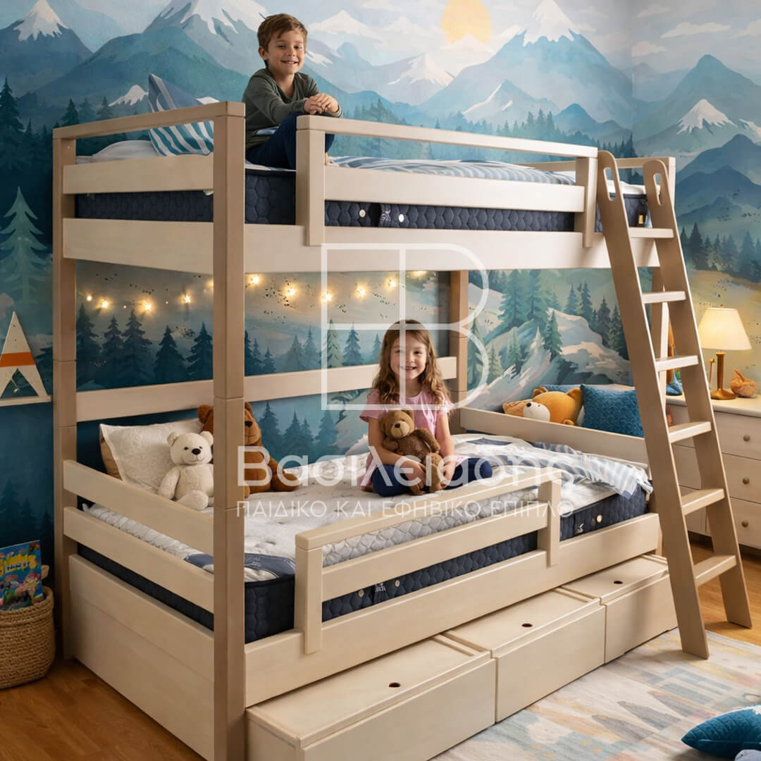 Η κουκέτα προτείνεται σε απλή διώροφη, ή με προσθήκη 3ου συρόμενου κρεβατιού, ή με προσθήκη τριών ανεξάρτητων Έξυπνων συρταριών αποθήκευσης με καπάκια συρόμενα για προστασία από την σκόνη. Έτσι καλύπτουμε τις ανάγκες με μία από τις προτάσεις μας.