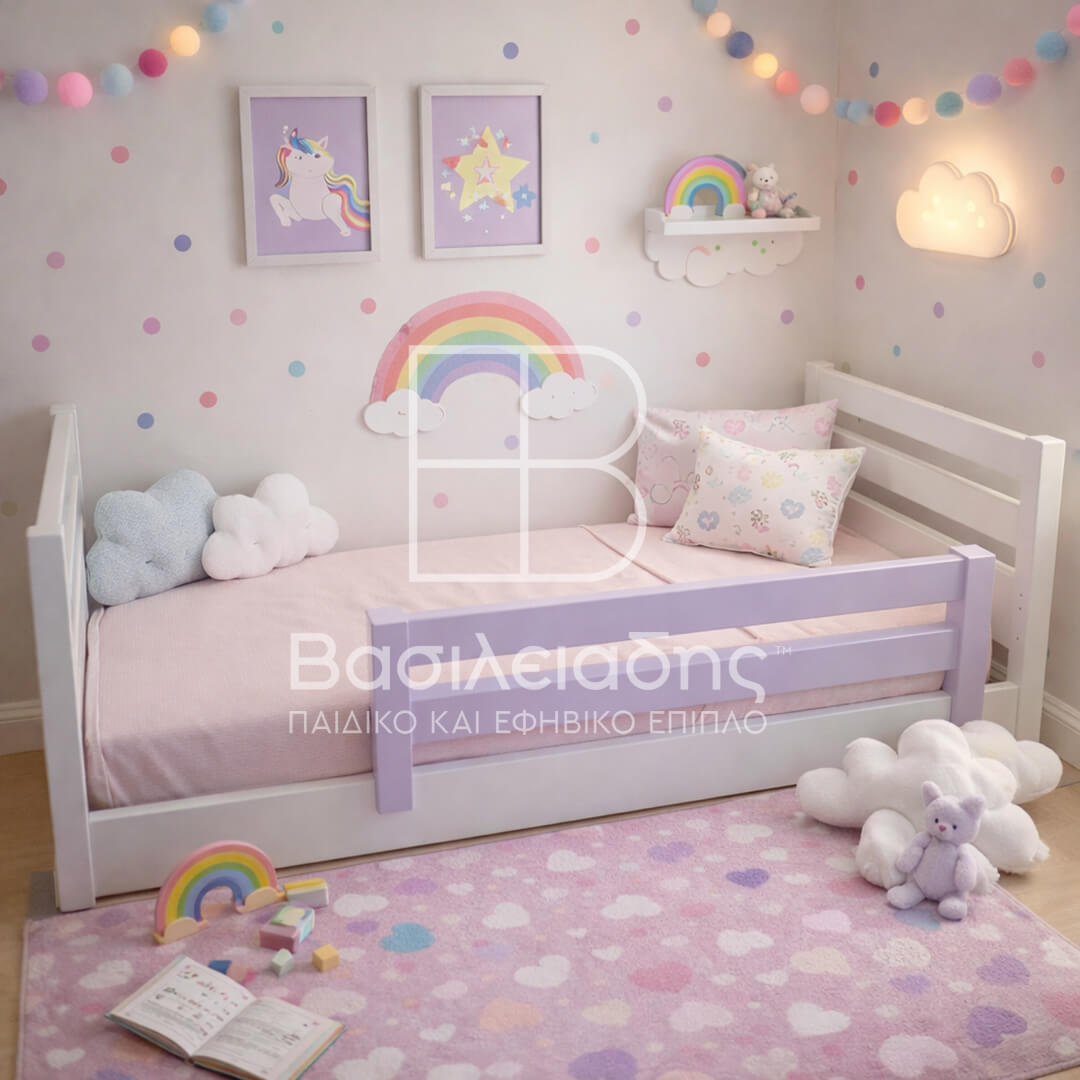Κρεβάτι από μασίφ ξύλο πεύκου και καπλαμά δεσποτάκι με δυνατότητα αρχικής χαμηλής τοποθέτησης τραβερσών στο πάτωμα για μικρές ηλικίες σε συνδυασμό με τοποθέτηση προστατευτικού.