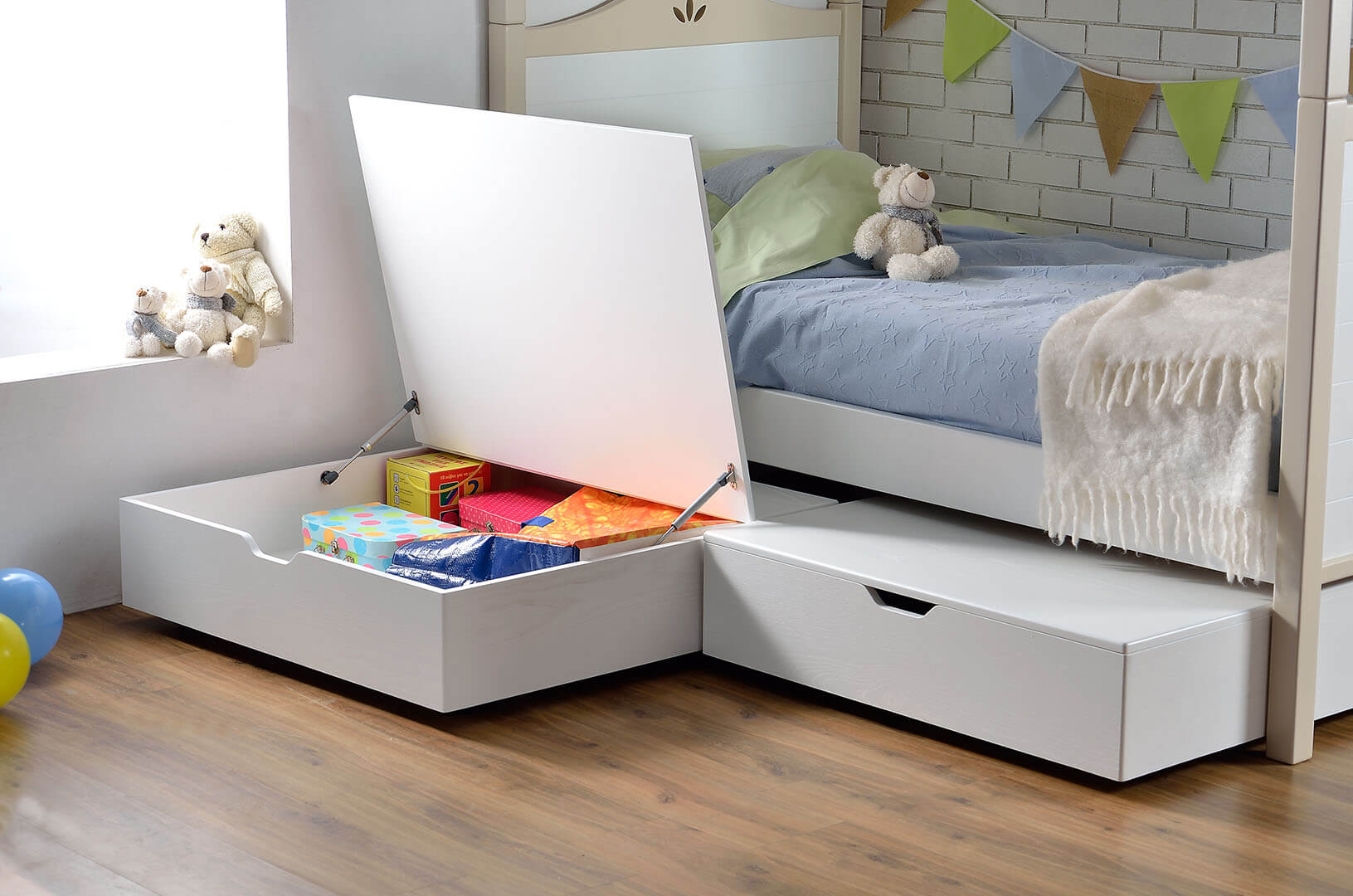 Δυνατότητα προσαρμογής αποθηκευτικού χώρου συρταριών, με καπάκια για προστασία από την σκόνη ή 3ου συρόμενου κρεβατιού.